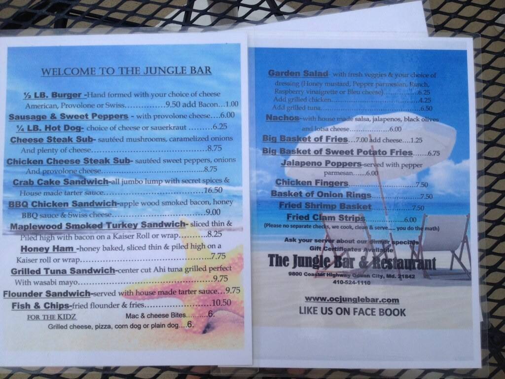 American Traditional Bars 410 524-1110. View the online menu of Jungle Bar and other restaurants in Ocean City Maryland. This is not a place for drink specials or the waitress on college break.